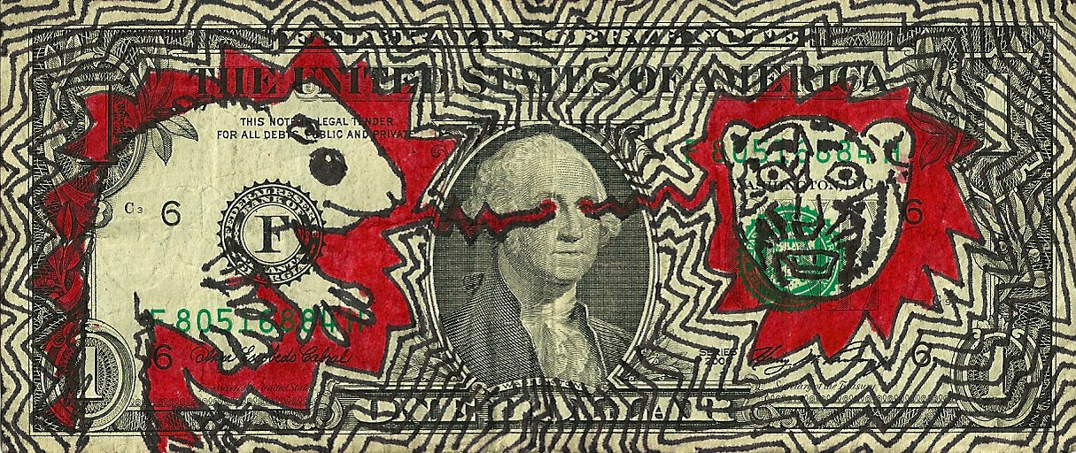 "All the artwork for this show utilizes the U.S. One Dollar Bill as a canvas. There will be one hundred artists in the show. All the artwork is available for one hundred dollars each."